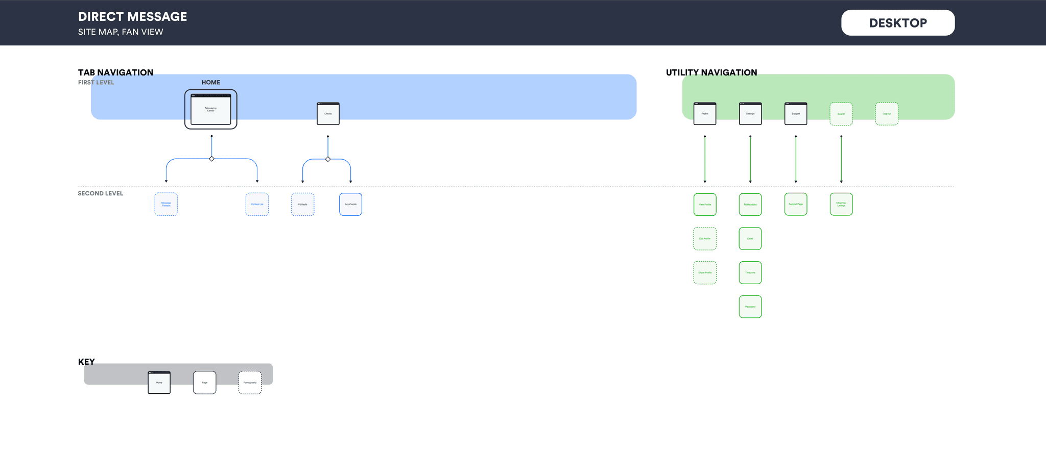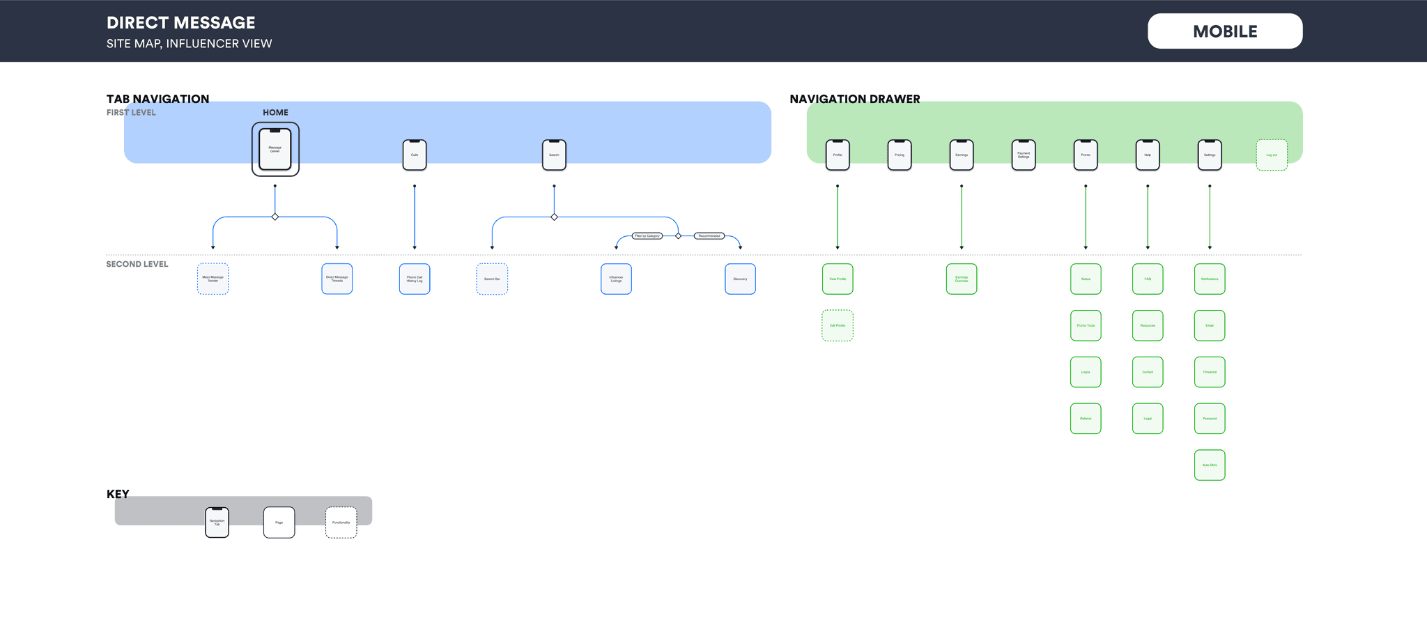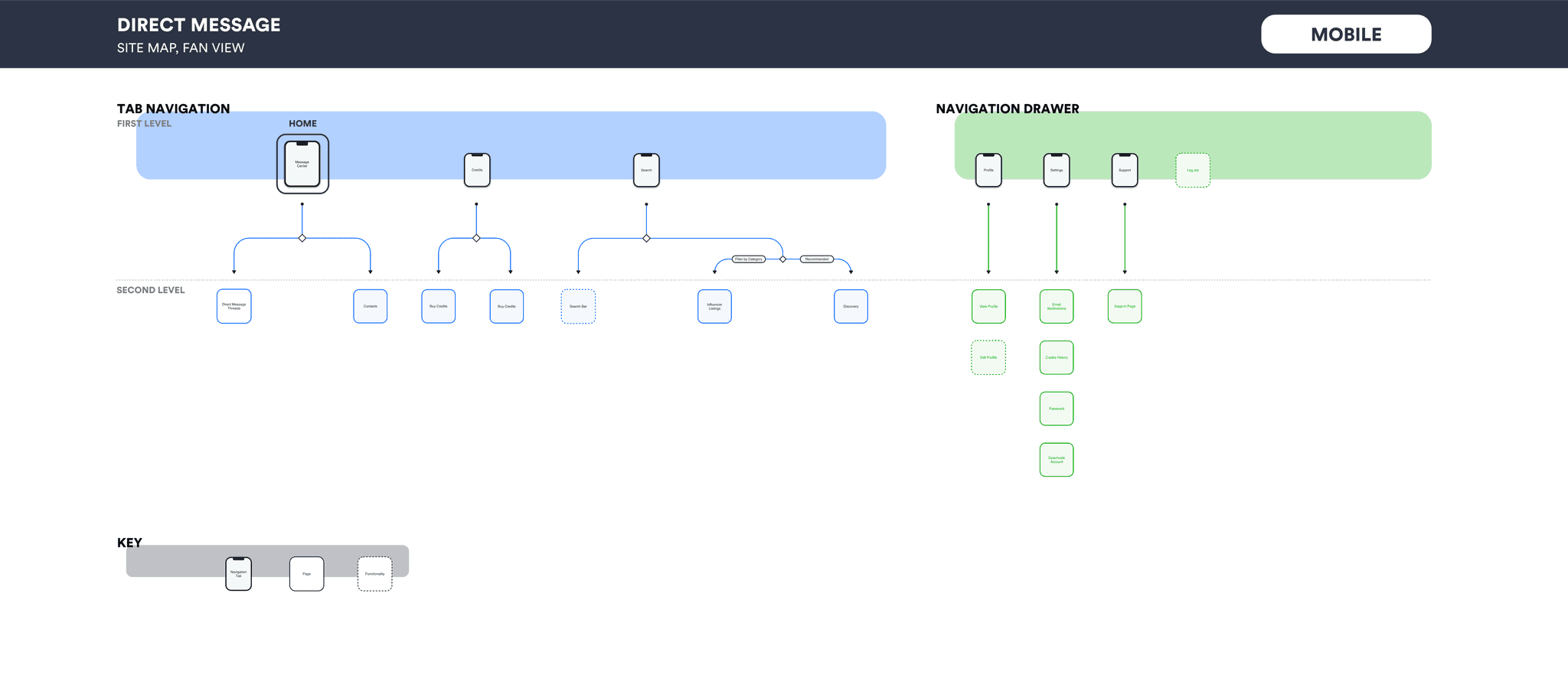 I began with competitive analysis, studying Cameo, OnlyFans, and similar platforms to identify best practices and gaps. Using the existing framework from the previous project, I created site maps and user flows tailored to this new use case, ensuring that the transition from fan to creator was smooth and intuitive. The focus was on mimicking the feel of Instagram DMs, but with a layer of monetization.
